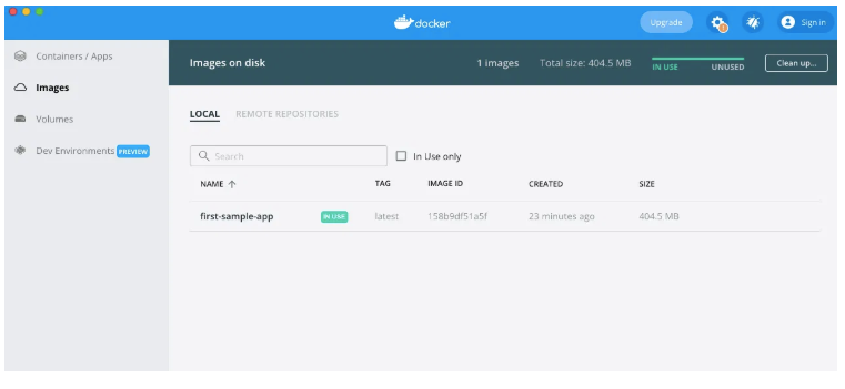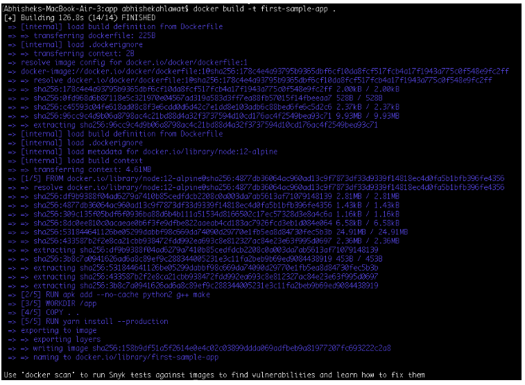 docker build -t first-sample-app .In the docker build command above, the -t flag tags our image. By tagging, we mean giving a name to the docker image, in this case, the name is first-sample-app, and the . at the end of the docker build command tells that Docker should look for the Dockerfile in the current directory.