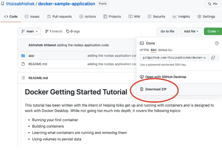 Download the sample application from the Github repository. Here is the URL for the GitHub repository: docker-sample-application