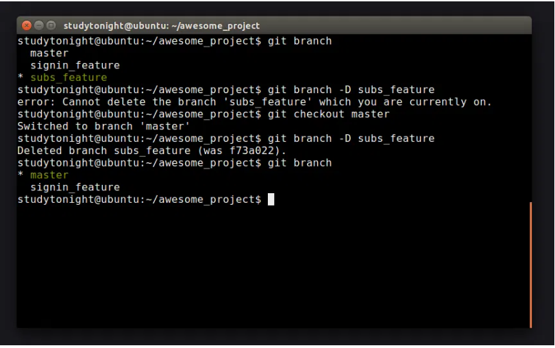 Oops! We can't delete the branch we are currently working in. Switch back to master and try again.