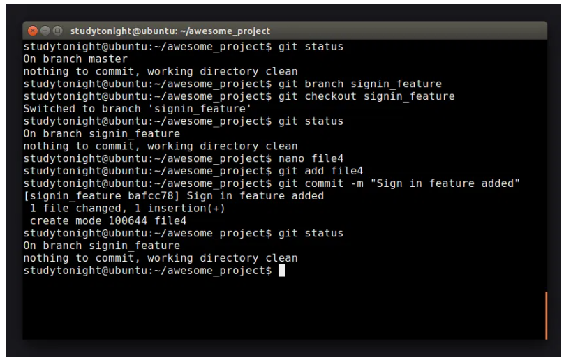 Let's consider that our awesome_project is based on a Web Development Project. You are currently on the master branch and it's going great, but you need to add a sign-in feature to your project. Now you certainly don't want this code to mess with your current code, do you? So let's give the feature its own branch. You create a new branch by using git branch command. Check the status of the repository to make sure you don't have anything to commit.