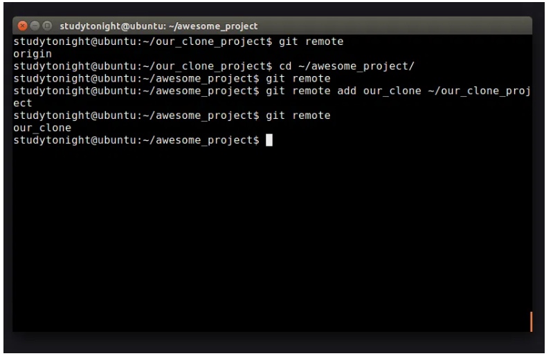 But the problem here is that we want our two repositories to communicate to each other and our awesome_project has no idea that our_clone_project exists. Let's fix that by using the $ git remote add command. You need to provide a name for this add, and using origin does not make sense here. Let's call it our_clone and provide the path to our repository. Poof! That's done!