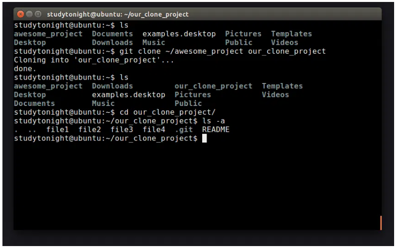 If you are working on a different computer, this will probably be a network address. If the repository is hosted on some server, this will be a URL. Right now, we can provide it a path to our awesome_project repository. Let's name our clone our_clone_project.