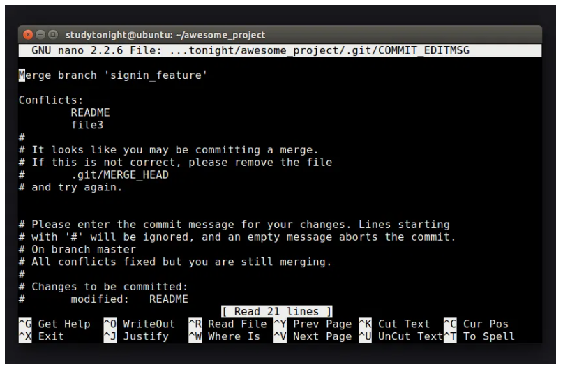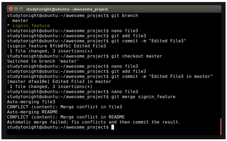 Notice that Git knows we are resolving a conflict and has already prepared a commit message for us. There, the conflict has been resolved and the two branches merged successfully. Keep in mind that in such cases, Git relinquishes all control over resolution of merges and it completely depends upon you to solve it.