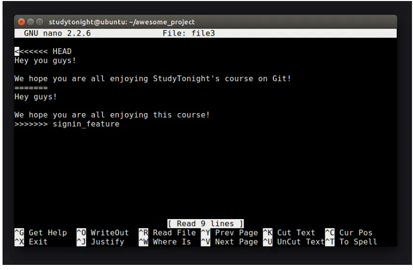 That's right, Git marks the area where the conflict occurred. Pretty smart and helpful, eh? They are called conflict markers. The angled brackets indicate that the whole area is conflicted. The row of equal signs is the separator between the two versions. The top version is labelled head which is a special term for the latest commit. The bottom version is labelled signin_feature, no prizes to guess what it means.